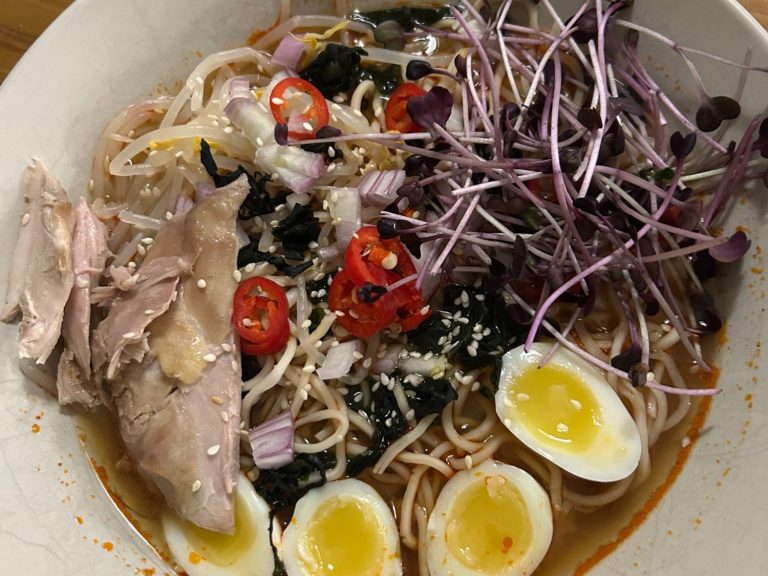En av mina favoritgrejer med det här receptet är att jag oftast har basingredienserna hemma. Kycklingskrov finns det i regel gott om, likaså vaktelägg och mikrogrönt. De mer speciella ingredienserna kan man köpa en gång, ha i skafferiet och dra fram när det passar. De är dryga, och blir inte dåliga, så man kan få många ramen-soppor för samma peng. Det gör den här soppan väldigt billig, fastän den till synes har en del exotiska ingredienser.